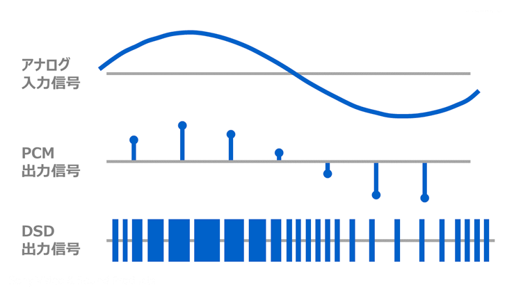 Direct Stream Digital(DSD)は、 CDなどで採用されているPCM方式のサンプリング周波数や量子化ビット数を増やしていくという、従来の延長線上の手法ではなく、広帯域を直接1bitデジタルデータに変換、音声信号の大小をパルス波形密度(濃淡)で表現する方式です。
