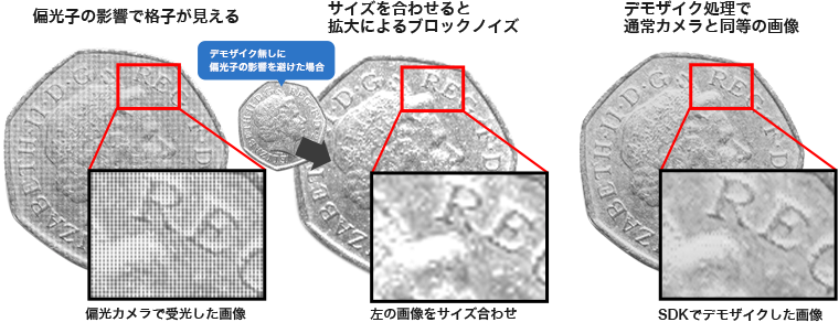 このモザイク状に見えてしまう弱点を補うべく、弊社では偏光処理のために独自のデモザイク処理を開発しました(図3)。