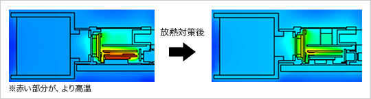 また、熱シミュレーションを実施し熱が1か所に集中することなく、熱源から均等に拡散するような、最適な放熱構造となるように検証を行っています。