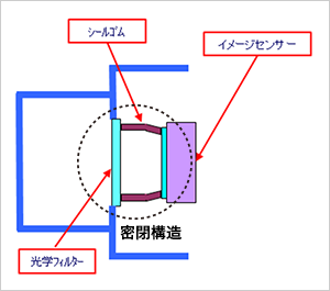 イラスト:イメージセンサー、光学フィルター、およびシールドゴムで密閉されたカメラの密閉構造