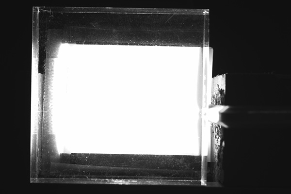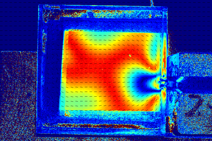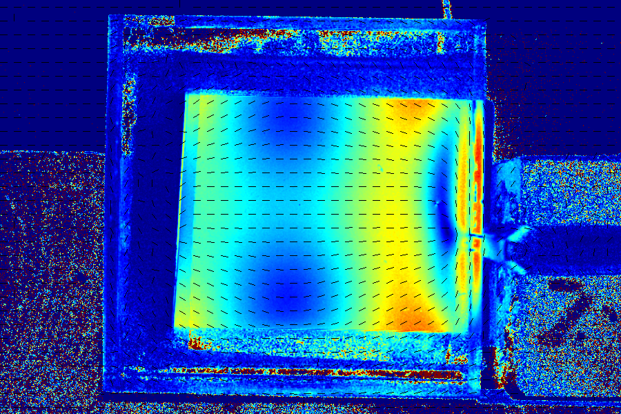 物体内部にかかる力を応力という。応力は外から力をかけた時に発生し、外力を除いた後にも物体内に残ることがある(残留応力)。応力が生じた時のひずみの大きさと向きに応じて、複屈折の大きさと向きが変化する物質を光弾性体という。 透明・半透明の光弾性体に偏光光をあてると、ひずみの大小によって複屈折した偏光に位相差が生じる。これを観測することで物体にかかる応力の大小を確認でき、サンプルビューアでは観測された位相差を色で視覚化して表示している。第7図はアクリル板の右側側面に金属の棒を挟み込み、左右から万力で圧力を加えている図である。人の目ではわからないが、第8、9図のように応力を観測すると、金属が支点となりアクリル板に応力がかかっていることがわかる。