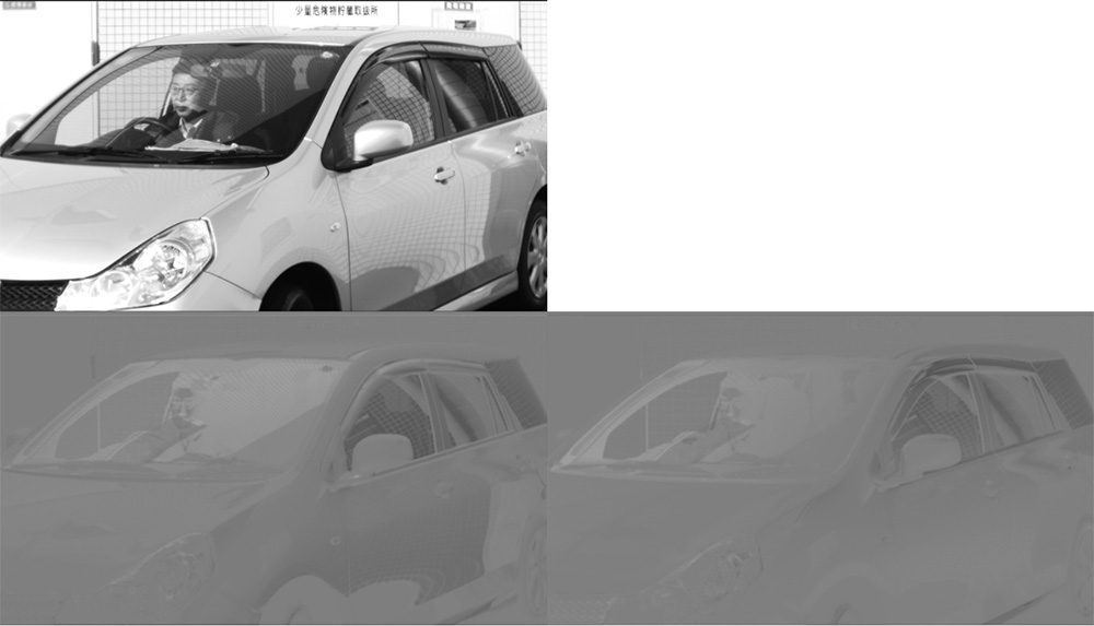 反射除去(第11図)のメリットとしては、車のフロントガラスや水面などの写りこみ部分を除去することによる視認性向上があげられる。 また反射強調(第12図)はガラスのように透過率の高い物体に対して、反射成分を強調することで通常のカメラでは困難だった位置や形状を特定することができる。