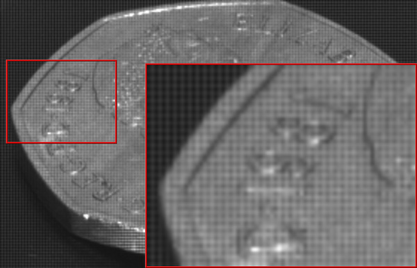 偏光イメージセンサはワンショットで4方向の偏光を取得できるメリットがある一方、4方向の情報を元に数値計算を行っているため、各偏光方向の画像は全画素の1/4の解像感になってしまうデメリットがある。XCG-CP510で搭載している偏光イメージセンサIMX250の場合、約507万の有効画素で最大 2464×2056の解像度を持つが、偏光の情報量という意味ではこれが 1232×1028の解像度となる。