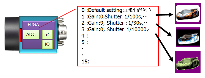 カメラに搭載しているFPGA内部にGain, Shutter, Wite Balanceなどの設定情報を16種類(デフォルト含む)の保存が可能です。