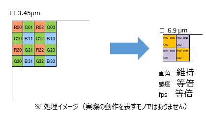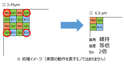 縦横2ピクセル単位でのビニングに対応し、画角を変えないでのフレームレートの増加※と、 感度の向上に寄与します。