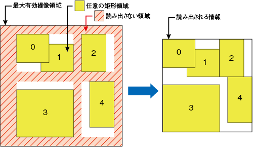 最大有効撮像領域から任意の2か所(最大)の矩形領域を含んだ映像を読み出すことができます。