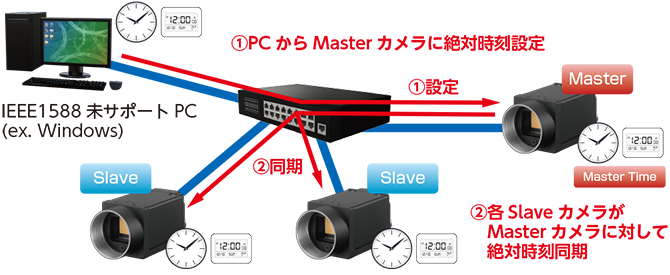 - 全てのカメラのタイムスタンプがマスター時刻に同期