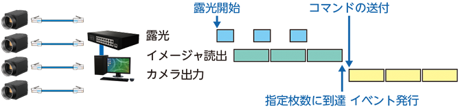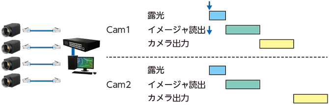 通常は露光が終了すると順次画像が出力されますが、画像出力の開始タイミングを遅延させることができます。同一のネットワークに複数のカメラが接続されていて、同時に動作させると1Gbpsの帯域を超えるような構成において、同時に露光する必要がある場合に有効です。