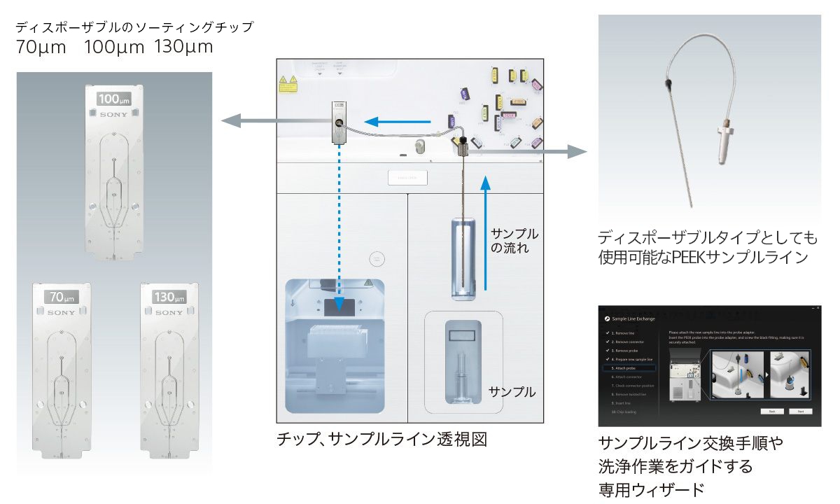 ソーティングチップは、細胞の種類やアプリケーションにあわせて3種類のオリフィスサイズから選択可能なほか、ディスポーザブルタイプのため簡単に交換でき、メンテナンス作業も不要です。