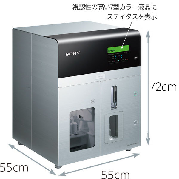 レーザー集積技術や小型機構技術を利用して、他社の一般的なセルソーターに比べ、本体を約3分の1に小型化(幅55cm/奥行き55cm/高さ72cm)しました。