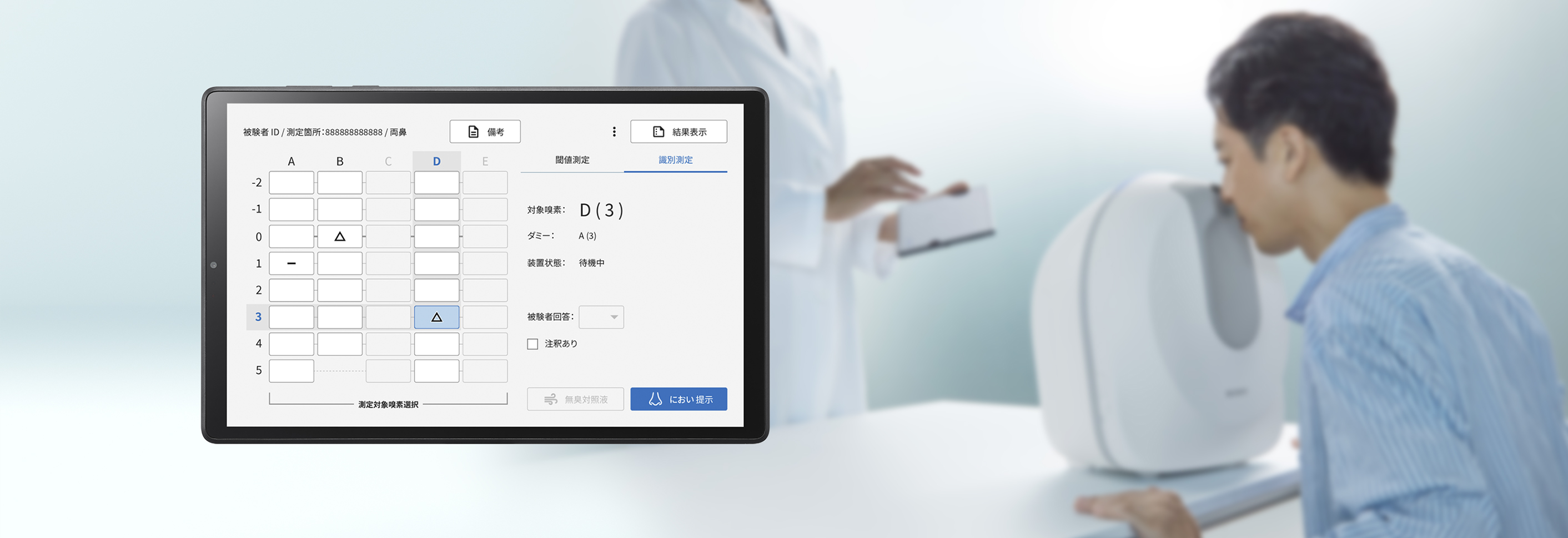 測定者はタブレット操作で、においを選択して、被験者に提示します。