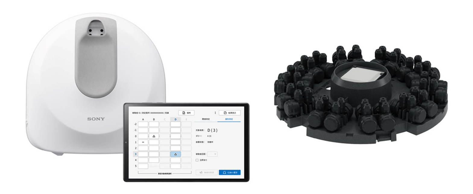 におい提示装置と一緒に使用する専用カートリッジとなります。嗅覚閾値の研究を行うことを目的に、5種類の嗅素を8段階に希釈した研究用試薬を封入しています。専用アプリを使った操作によりにおい提示が手軽になります。