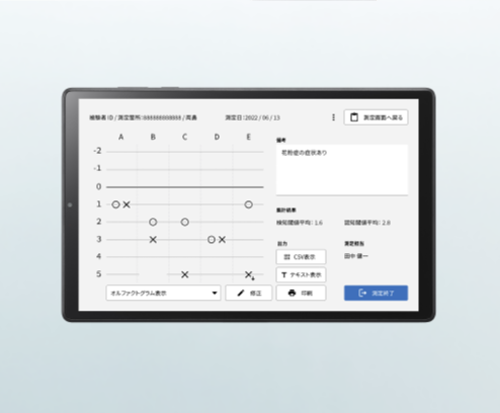 タブレット上に測定結果が表示・記録されます。※画面はイメージです。
