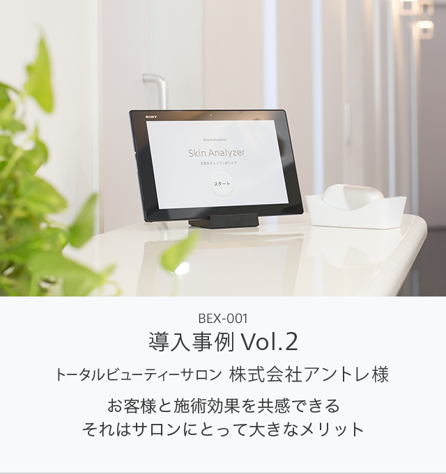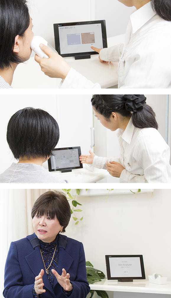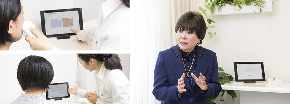 私はサロンワークにおいて、肌測定は必要不可欠だと思っています。そのため、以前から弊社では他社の肌測定機を導入していました。しかし、度重なる故障やその都度かかる修理費などにも頭を悩ませ、もっと使い勝手のよい商品への切り替えを検討していたところ、ニュースで「BeautyExplorer™」の誕生を知りました。ソニーが満を持して発売するという商品に期待は高まり、さっそく詳細を聞きに伺いました。そこで「利用者の意見を取り入れながら、進化をしていく」という商品特長を聞き、これは画期的なアイデアだと思ったんです。継続的に使用をすれば、不便に感じる点や新たに欲しい機能も出てきます。しかし通常の商品の場合、買い替える以外に、それ以上の変化は望めません。その点、BeautyExplorer™は、利用者の意見を常に取り入れながら、日々進化することを目指している。この新しいコンセプトに驚いたと同時に、大いに期待が持てると思い、導入を決めました。