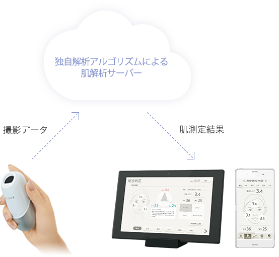 肌解析技術SSKEPはクラウド上にて運用され、クラウドサーバーと高度なセンシング技術を組み合わせることにより、さまざまな肌状態の情報を、定量的かつ多角的な測定で解析します。 クラウドサーバーを使いながらも解析の高速化を行い、素早く解析し、結果をすぐに表示します。