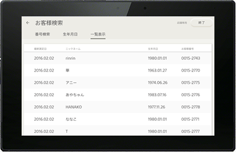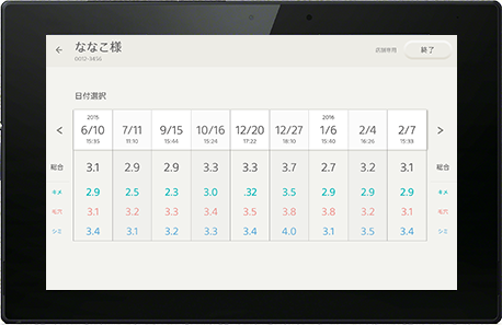 お客様を検索し、過去の測定結果を確認できる結果閲覧機能を搭載。 任意の測定日の測定結果を確認することができるので、