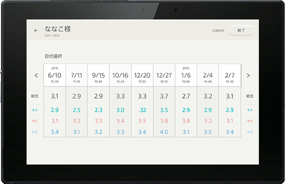 お客様が測定結果閲覧へ同意いただいた場合、同意いただいたお客様の測定結果がSkin Analyzer上でいつでも確認できるようになります。
