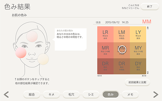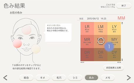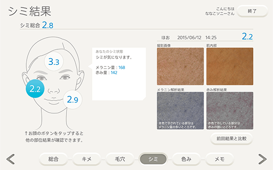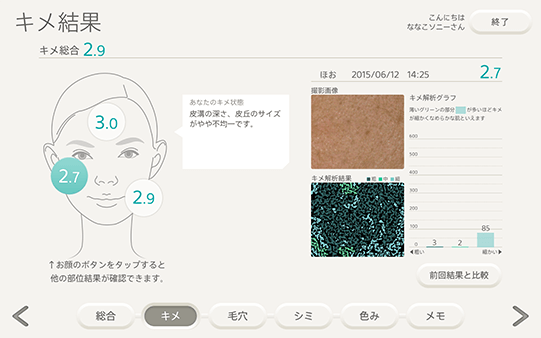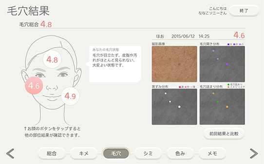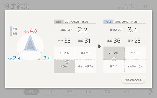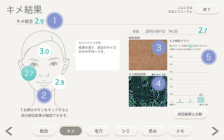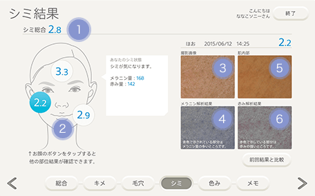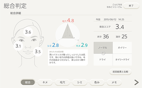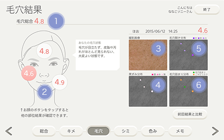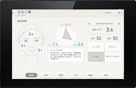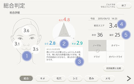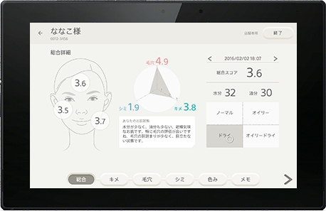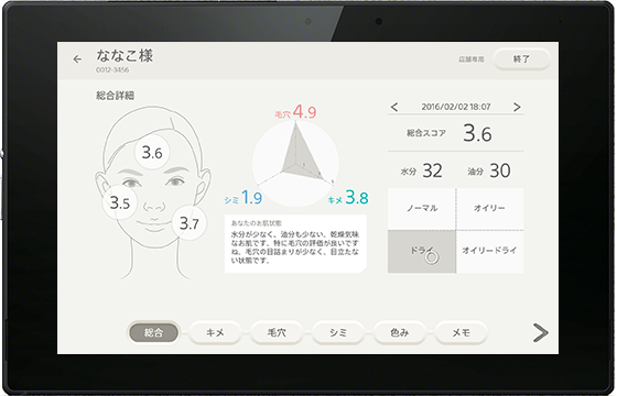 <測定項目> 総合スコア/水分/油分/肌状態(ドライ・ノーマル・オイリードライ・オイリー)/キメ/毛穴/シミ/肌の色み