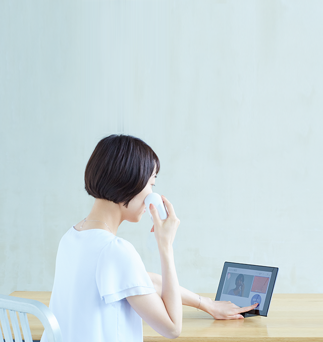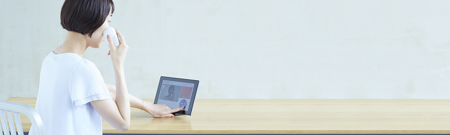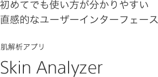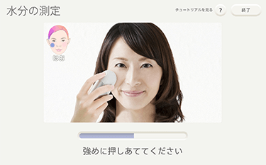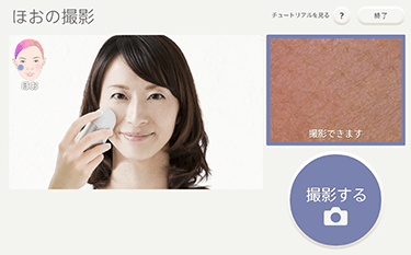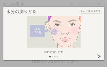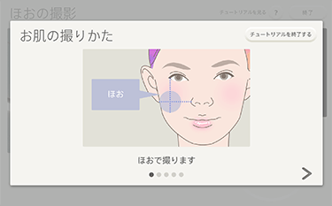 肌解析アプリSkin Analyzerは、お客様のタブレットに インストール頂くことによって、測定開始から結果表示まで「測定箇所」「測定タイミング」などがアプリ画面上に案内表示されるので、初めての人でも迷わず測定をすることができます。