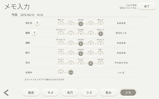 食事や睡眠などの状態を記録すると、肌測定の結果と生活との関係を確認できるため、