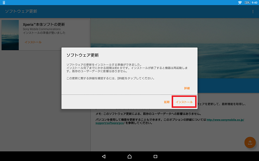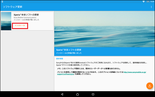 *[タブレット情報]が見つからない場合は、画面を上下にフリックしてください。 - [ソフトウェア更新]画面が表示されるので、[Xperia本体ソフトの更新]を選択し、[インストール]をタップします。