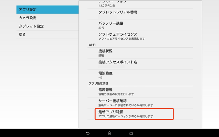 - パスワードを入力し設定画面を起動後、[アプリ設定]>[アプリ設定項目]>[最新アプリ確認]を選択し最新バージョンを入手します。