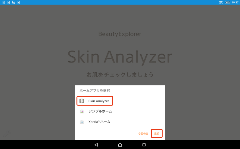 )を表示させタップします。 - ホームアプリを選択する画面が表示されるので、[Skin Analyzer]を選択し、[常時]ボタンをタップします。