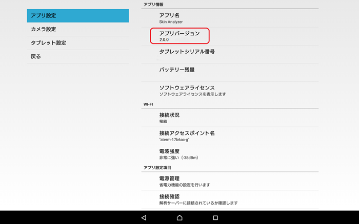 もしくはSkin Analyzer アプリバージョン2.0以上向けの『取扱説明書 接続編』の[無線LAN接続する]をご参照ください。3. Androidのアップデート(Android バージョンが5.1.1になっている場合は4. Skin Analyzerアップデートへ進んでください。)