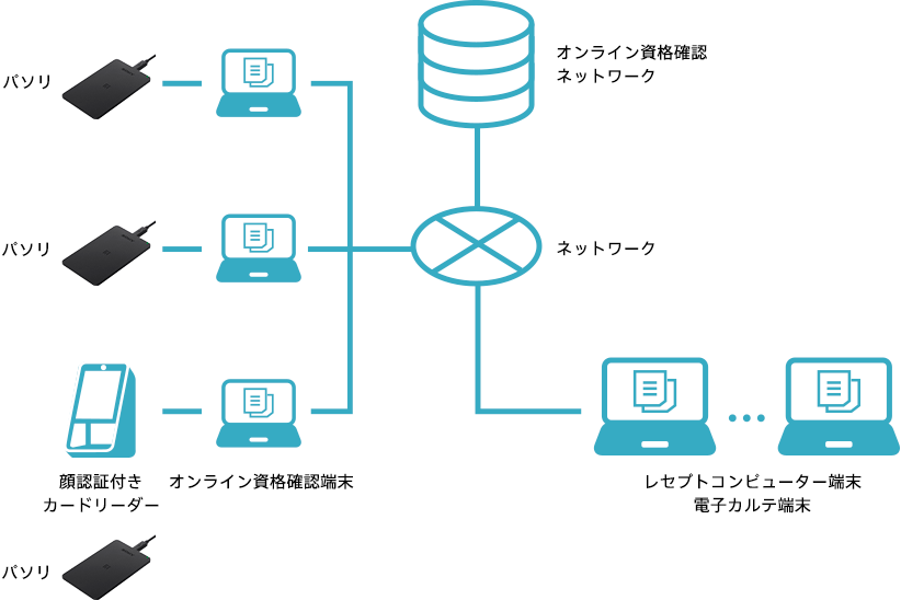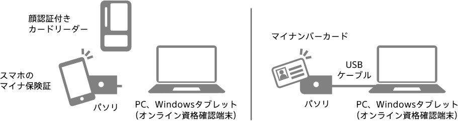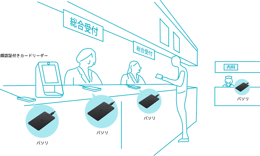 パソリはオンライン資格認証用のカードリーダーとしてご利用いただけます。患者がパソリにマイナンバーカードをかざすとともに、カード上の顔写真を受付職員が目視で確認することにより、ご本人の確認を行います。また、顔認証付きカードリーダーが接続されているオンライン資格確認端末にもご利用いただけます1)。1) お使いの顔認証付きカードリーダー端末のパソリ対応状況につきましては、製造元にお問い合わせください。