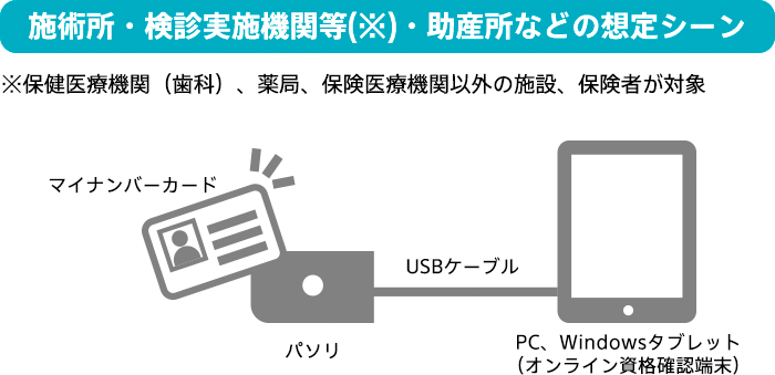 パソリは、柔道整復師、あん摩マッサージ指圧師、はり師およびきゅう師の施術所、特定健診・保険指導実施機関(保管医療機関(歯科)・薬局・保険医療機関以外の施設・保険者)、助産所が利用できる「オンライン資格確認(資格確認限定型)」でも ご活用いただけます。事前に利用申請したPCやタブレットに専用のアプリ(マイナ資格確認アプリ)をインストールしてパソリと組み合わせることにより、マイナンバーカードを読み取ってオンライン資格確認を行うことが可能です。