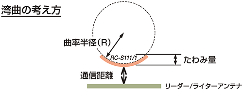 ※3 モジュールとして、平面状態と湾曲状態(長辺方向に曲率半径(R)= 35 mm)でFeliCaカードRF性能検定に適合しています。長辺方向に曲率半径(R)= 35 mm(たわみ量 = 2.21 mm)より小さな湾曲や、短辺方向に湾曲させた場合は通信性能が低下します。