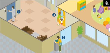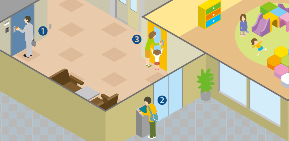 | ❸共用施設の入退室を管理 | フィットネスルームやキッズルームなど、共用施設の入退室管理も可能。 |