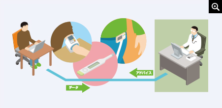 | ❷FeliCaで広がる健康ソリューション | ウェブサービスとの連携も可能。パソコンで管理するデータをもとに、病気予防をアドバイスする医療サービスなども構築できます。 |