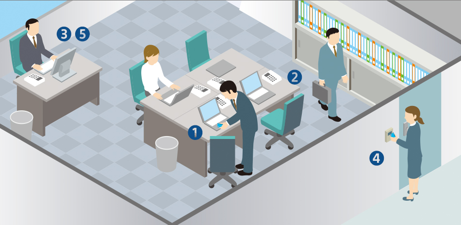| ❶PCログイン認証&ログ記録 | 各社員のパソコンは、各々のFeliCaカードでログイン認証。第三者による不正使用を防止。 |