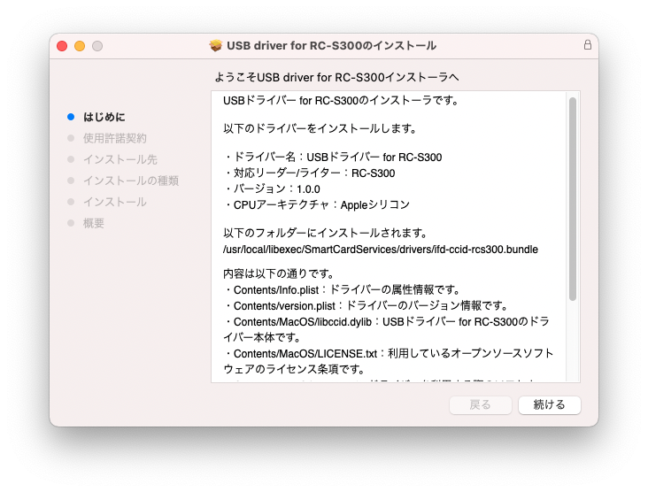 ダウンロードした「USB ドライバー for RC-S300」をダブルクリックしてインストーラーを実行します。