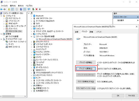 デバイスマネージャーを開き、デバイスのプロパティで[ドライバ]を選択。[ドライバーの更新]をクリックしてください。