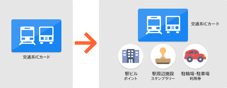 法人が異なる駅周辺施設の利用券や会員証、駅前商店街のポイントなどをあとから追加できるため、1枚のカードで地域連携の輪が広がります。