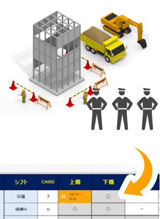 現場の警備員やスタッフは、警備設備や巡回拠点に設置されているICカードに、スマホをタッチするだけで出退勤(上下番)や巡回の記録が可能。管理者は、リアルタイムに現場の状況が確認可能です。