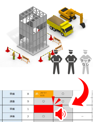 拠点に設置したカードに対し、設定時間にスマホタッチがない場合、モニタリング画面上のマップにアラートでお知らせします。