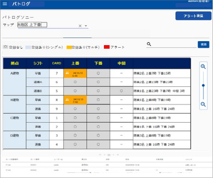 勤務、巡回状況はリアルタイムに反映され、「誰が上番したか」、「巡回ポイントを誰が巡回したか」