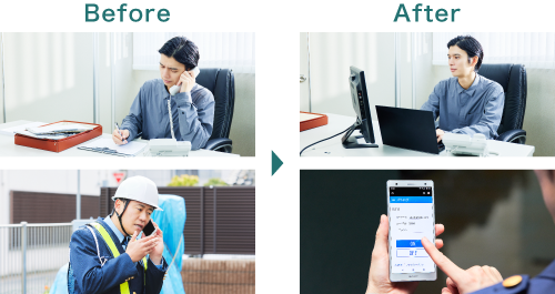 出退勤(上下番)、巡回連絡の電話対応や、報告内容の書類への転記、管理といった作業の手間を削減できます。