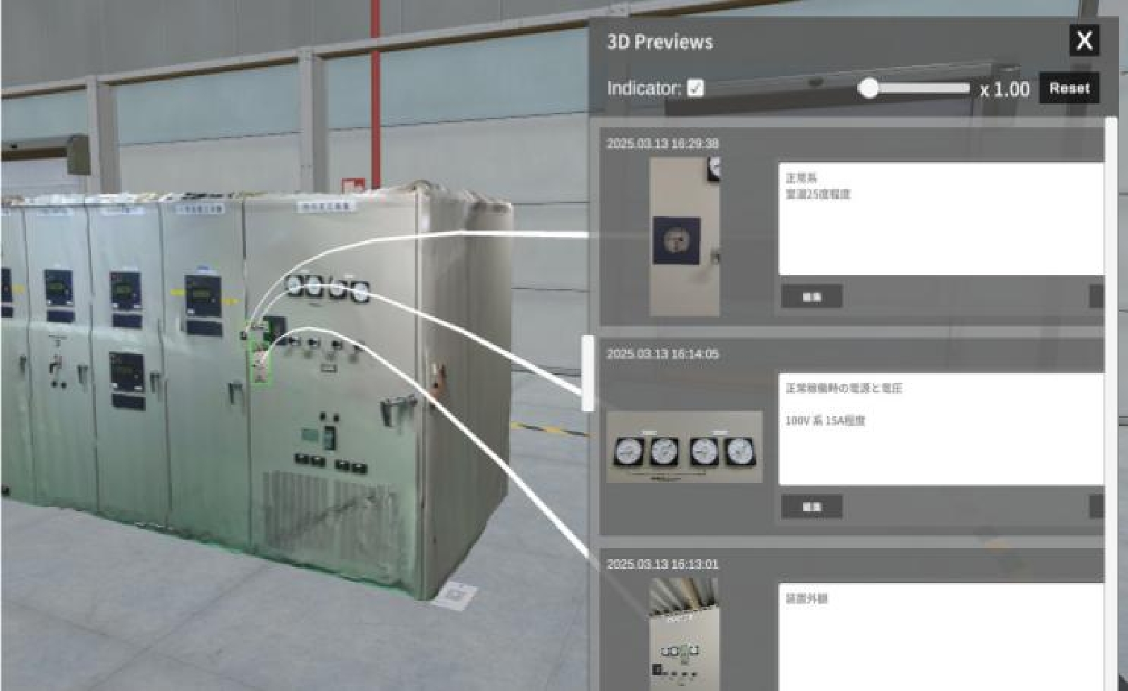 現場にて設備の状態を写真撮影すると撮影位置やアングルも含めて自動的に記録を残すことが可能です。
