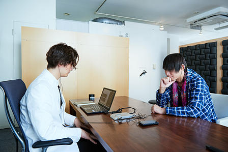 松尾:では次にオリジナルのシミュレーションソフトを使って、音質の好みを伺って調整します。まだ新しい耳型は完成していないので、お客様にはこちらで用意した「Just ear」、同時に私も自分の「Just ear」を使って、一緒に曲を聴きながらチューニングを。調整用の音源は、お客様がふだんよく聴かれるものをご用意いただきます。今日は、まずはミトさんがいちばん音を知っていらっしゃるクラムボンさんの楽曲を使わせていただきますね。まずは"呼び声"をスタンダードな音質で流してみます。
