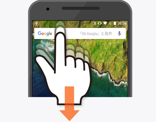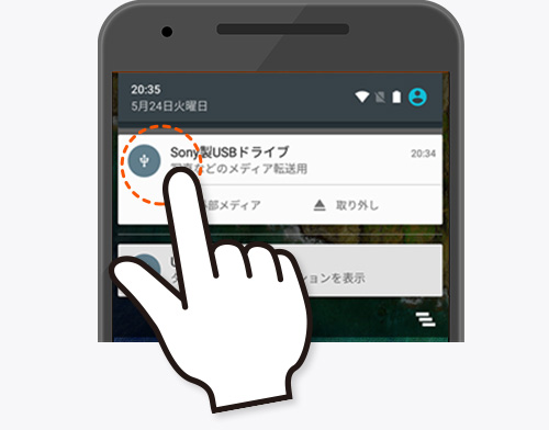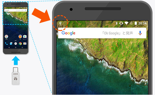 Android™ 6.0機器がポケットビットを認識すると、画面最上部にあるステータスバーにUSBアイコンが表示されます。