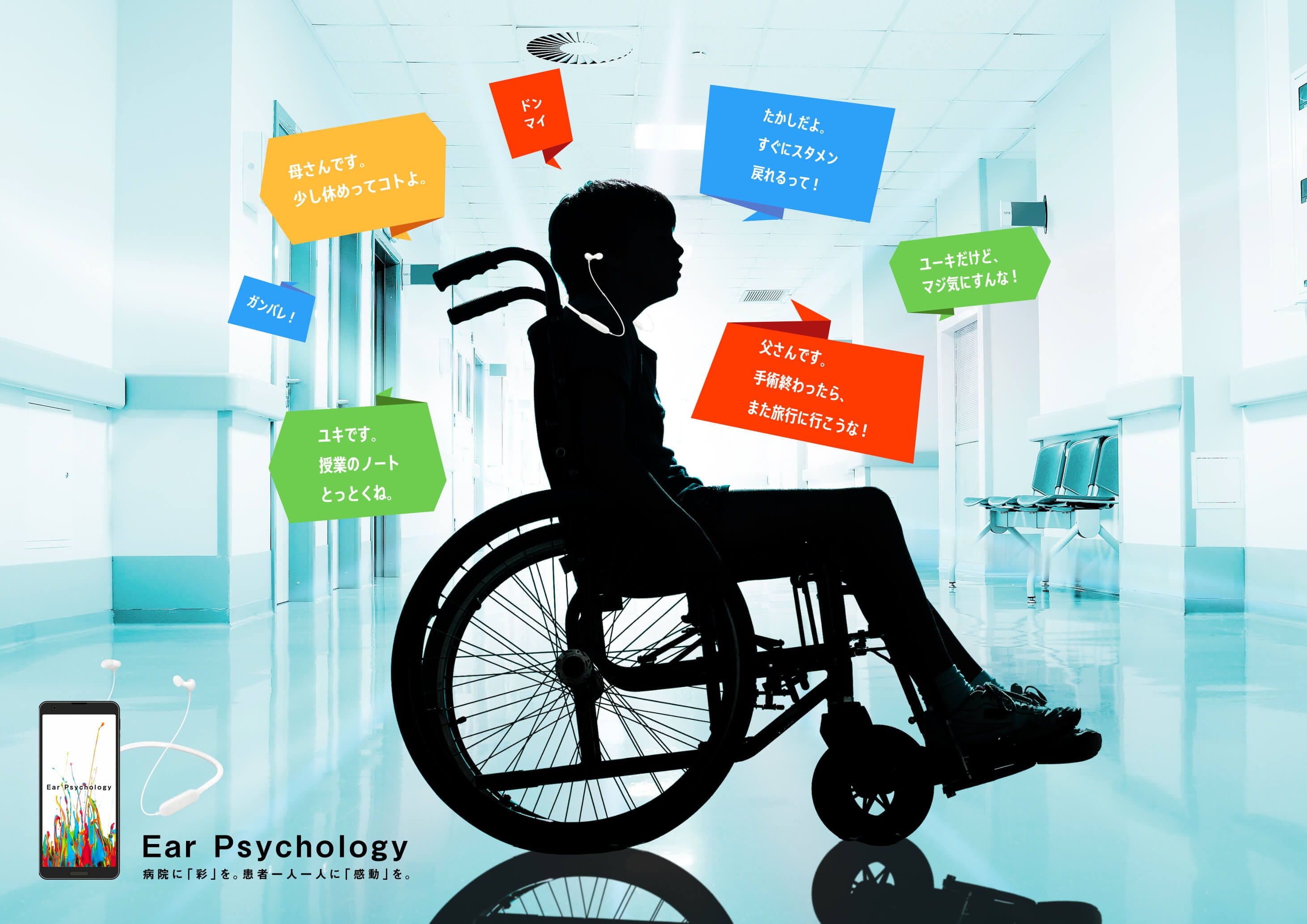 病院内にて、装着者の動きや状態に合わせた様々な「音」や「メッセージ」が再生されるオープンエアー型サウンドARデバイスの提案。患者の家族や親しい友人などが入力した情報(パラメータ)をもとに、おかれているシチュエーション、場所、時間なども加味し、患者の精神状態に合わせた最適な「音」や「メッセージ」が流れる。