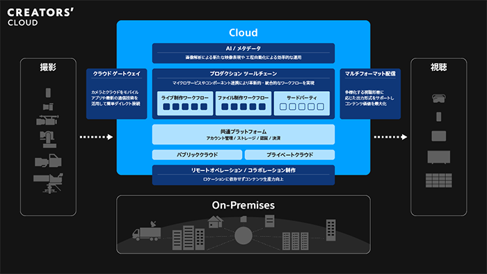 ソニーは、これまで培ってきたクラウド技術・サービスを更に発展させ、未来の映像制作ワークフローを見据えた次世代のクラウド制作プラットフォームを「Creators' Cloud」として導入します。本プラットフォーム上でソニーの様々なクラウドサービスを展開していきます。