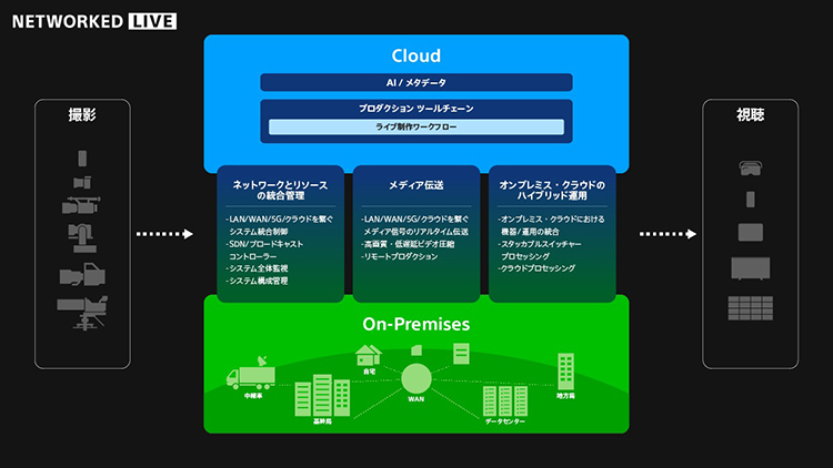 「Networked Live」は、クラウド上の制作リソースとオンプレミスの制作機器・人などのリソースをハイブリッドに活用することで、放送局などの効率的なライブ制作を実現する、ソニーが提案するライブプロダクションの枠組みです。「Networked Live」の導入により、場所や規模を問わずライブ制作の環境を構築することが可能になります。