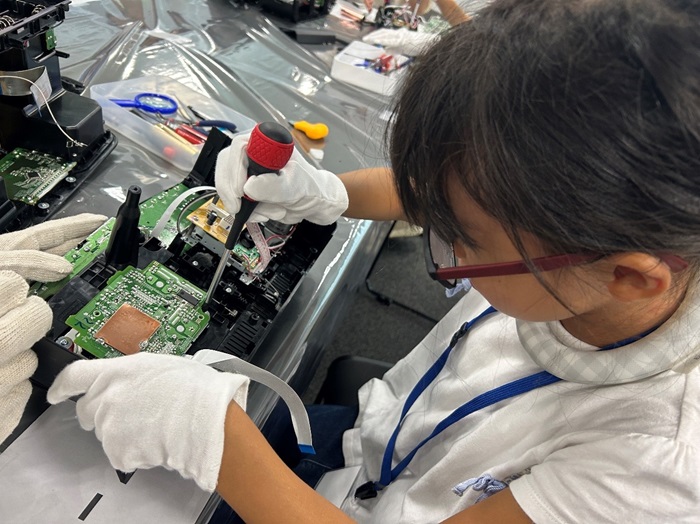 このワークショップでは、安全のため、時にボランティア社員にサポートしてもらいながらも、最初から答えや説明書を渡すのではなく、自身の頭で考えて答えを探りながら、自らの手で分解するということを大切にしています。