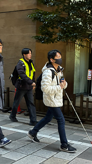 参加者は白杖を使いながら、VPSを搭載したEyeNaviの音声案内に従って歩行。安全のためスタッフが見守りサポートしつつ、横断歩道の通過や曲がり角など、実際の街歩きに近いシチュエーションで評価を行いました。