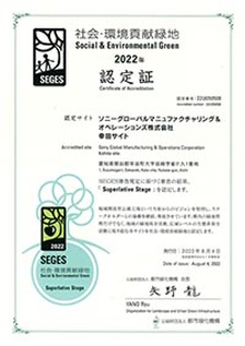 企業等によって創出された良好な緑地と日頃の活動、取り組みを評価し、社会・環境に貢献する良好に維持された緑地であると認定する制度、SEGES(シージェス)より、幸田サイトの「ソニーの森」の継続的な活動が評価され、SEGESの最優秀にあたる「緑の殿堂」を2017年に獲得。2022年も「緑の殿堂」を維持することができました。